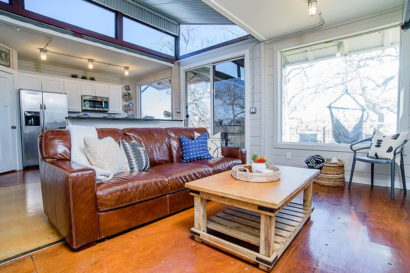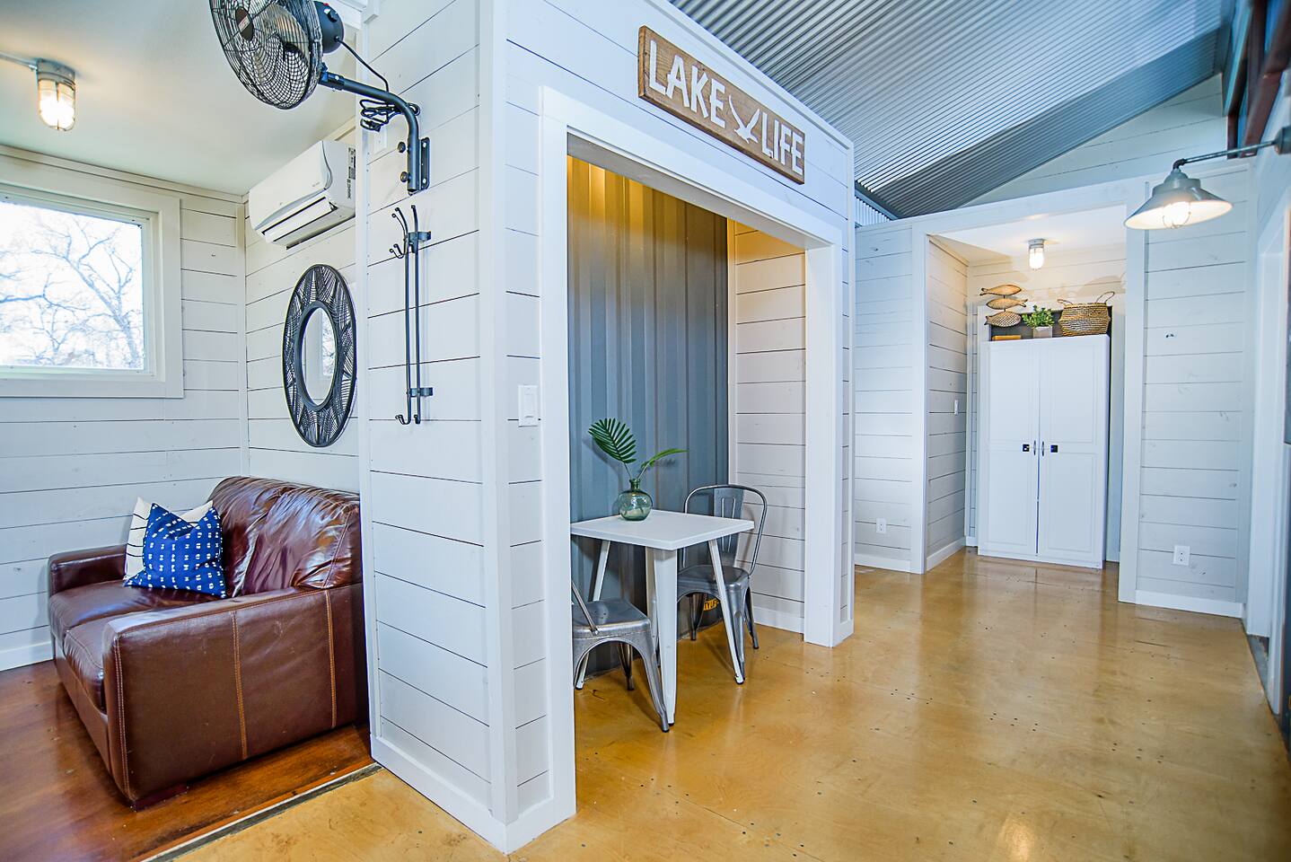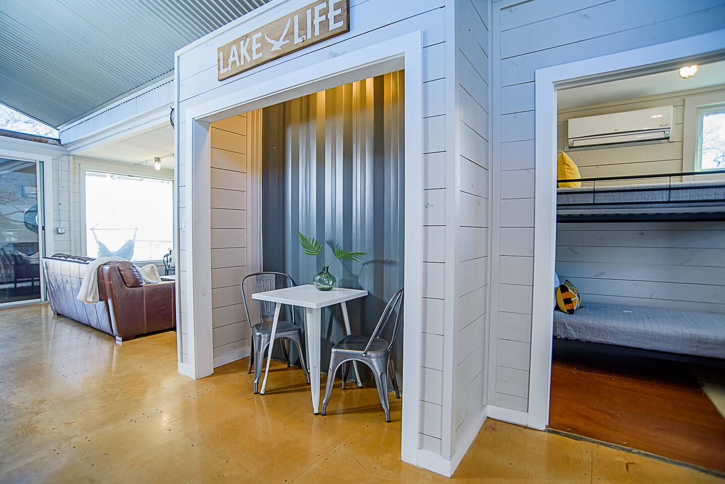 Welcome to Side A at Dam Camp! One of two container homes on a 3 acre property, this spacious waterfront home is located at the Lake McQueeney Dam on the banks of the Guadalupe River. Enjoy kayaking, paddle boarding, sitting by the fire, relaxing in a hammock, an outdoor shower and fishing at this relaxing retreat. Dam Camp Side A is short drive (10 miles) to Schlitterbahn Waterpark, Landa Park, Downtown New Braunfels, Comal River, Guadalupe River, and Texas's oldest dance hall, Gruene Hall.