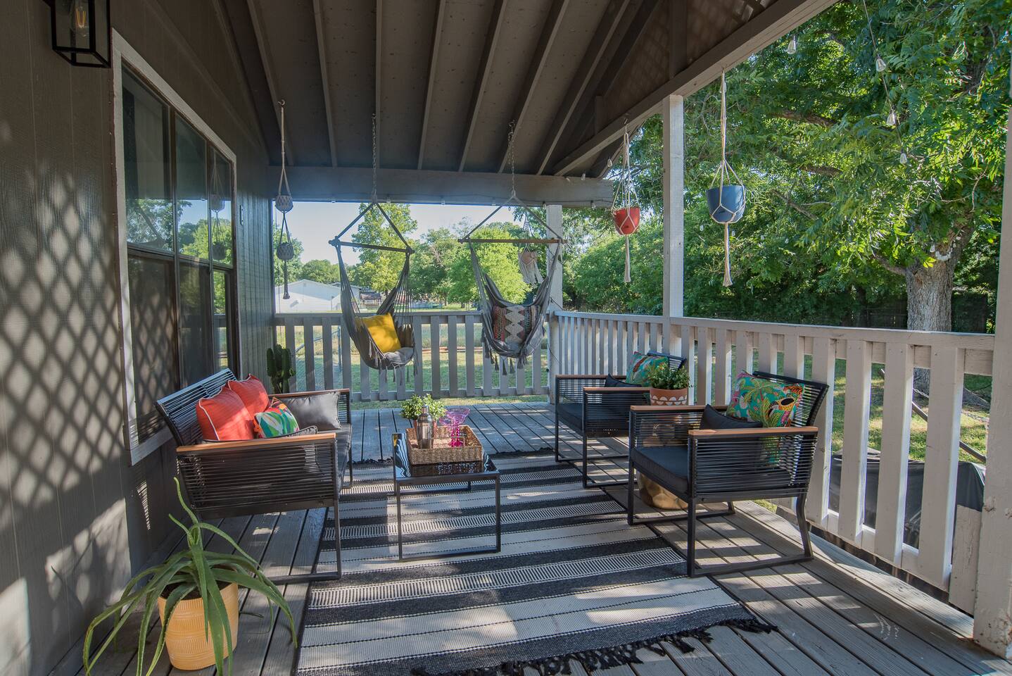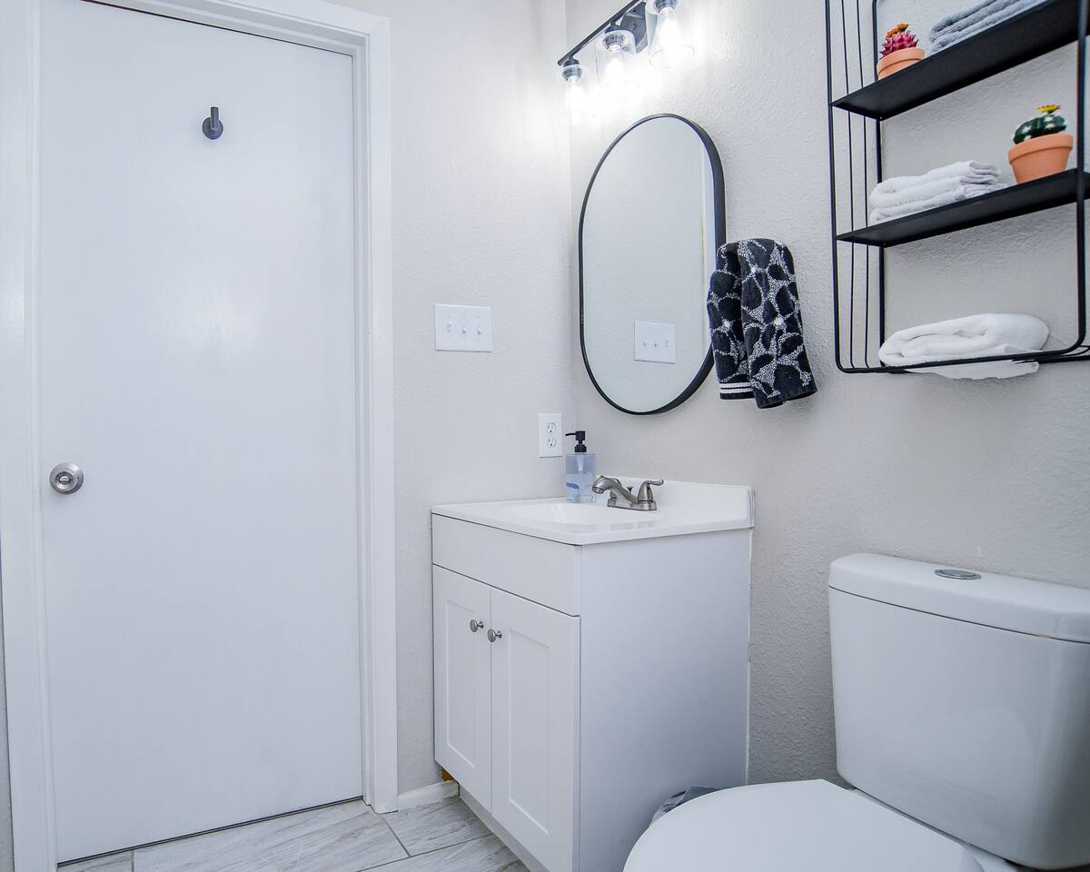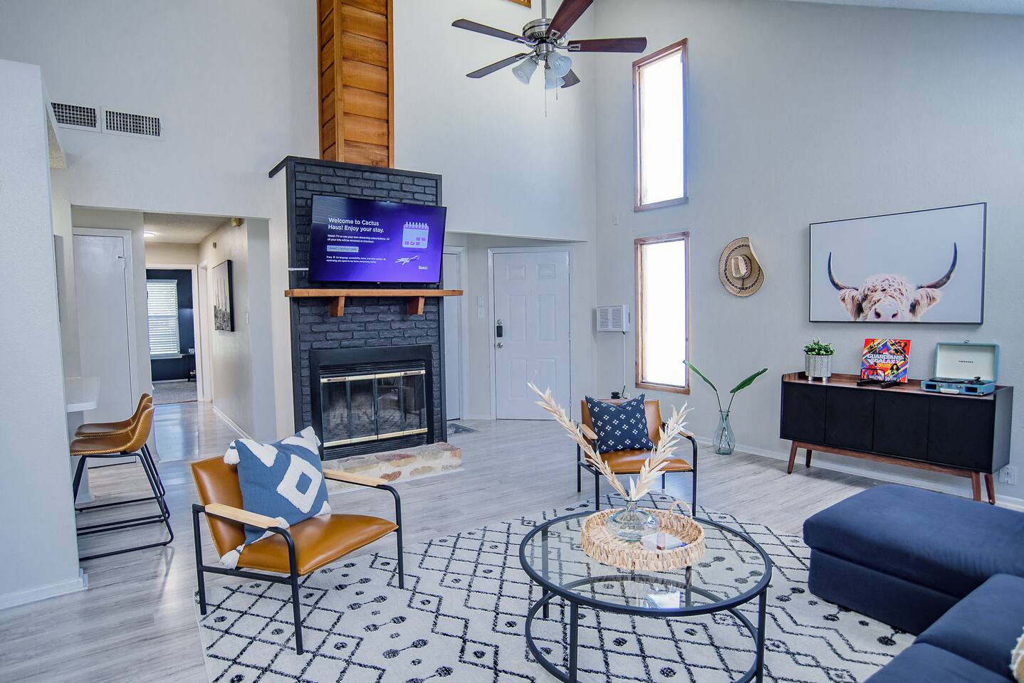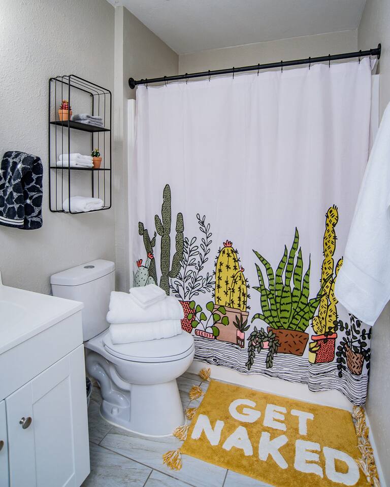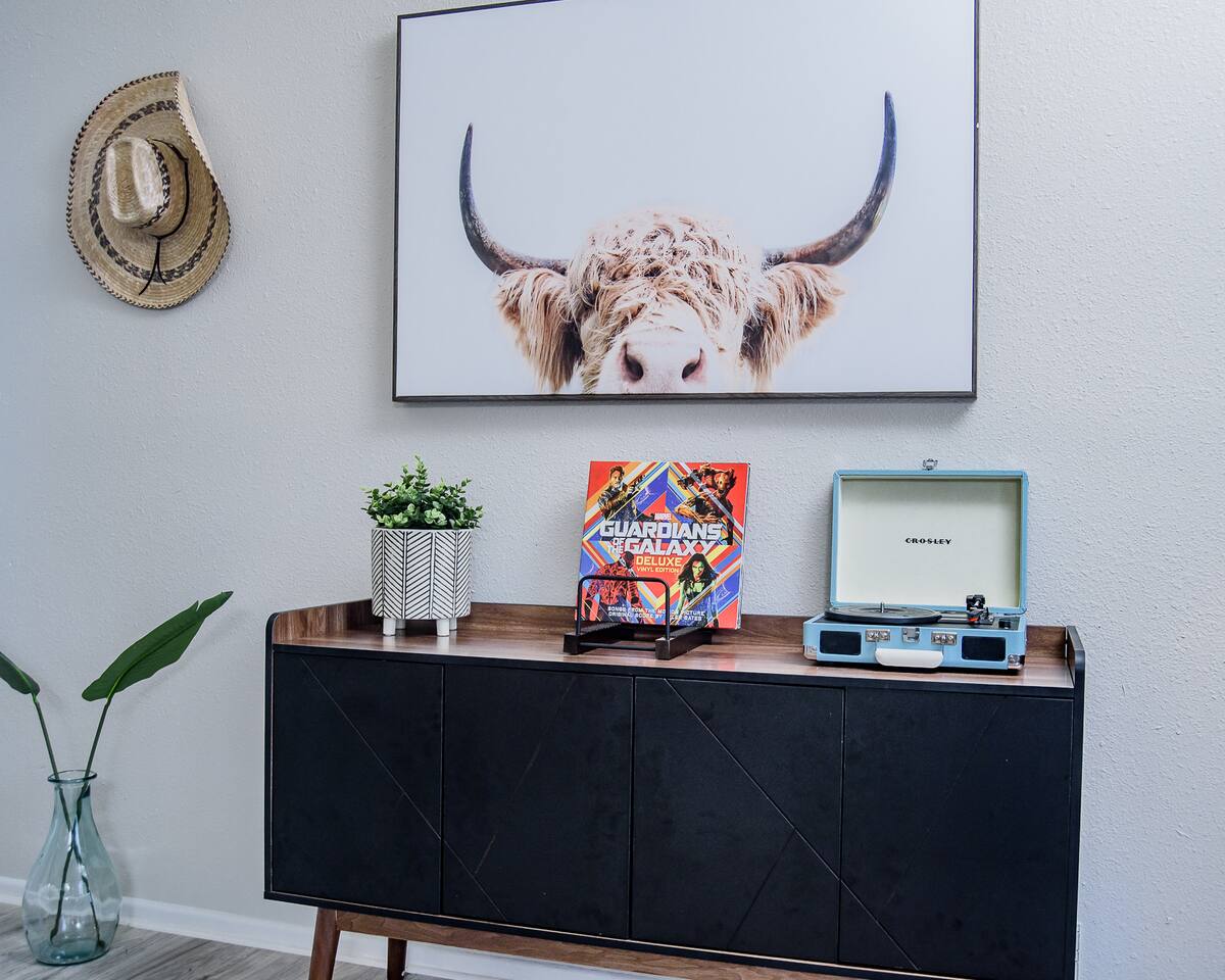 HIGHLIGHTS - 3 bedrooms / 2 bathrooms - Sleeps 6 - Large Spacious Gated Backyard, Fire Pit, Corn Hole, Yard Yahtzee, Board Games, Charcoal Grill, Hammock and Chair Hammocks, Coffee Bar, Record Player, High Chair and Pack-in-Play. SLEEPING ARRANGEMENTS - Primary bedroom - 1 king bed - adjoined bathroom - Roku TV - Secondary bedroom - 1 queen bed -Third bedroom - 1 double bed -Extra air mattress in living room. Introducing Cactus Haus, a modern Texas decorated home located in the charming city of New Braunfels, Texas. Situated on a spacious half-acre lot just outside the city limits, our property offers a peaceful and serene setting while still providing easy access to all the attractions and amenities in the area. Conveniently located just 5 miles from Downtown New Braunfels, 6 miles from Schlitterbahn Waterpark and the beautiful Comal River, and 9 miles from the historic Gruene district, our home is perfectly situated for you to explore and enjoy everything the area has to offer. The open floor plan of our home is designed to provide ample space and comfort for a single family or a group of friends. Whether you're on a family vacation, a weekend getaway, or a long-term stay for work, our home has everything you need to feel right at home. The master bedroom features a comfortable king-size bed, ensuring a restful night's sleep. Outside, you can relax and unwind in the chair hammocks or gather around the fire pit for cozy evenings under the stars. Stay connected with fast WIFI throughout the property, and enjoy your morning coffee at our convenient coffee bar. We also welcome work groups and families, offering amenities to accommodate their needs. With ample parking space for trailers and boats, our property is perfect for those who want to explore the nearby Schumann's Beach Boat Ramp and enjoy access to Lake Dunlap. Whether you're seeking adventure, relaxation, or a productive work stay, our Airbnb property in New Braunfels, Texas, provides the ideal base for your stay. Book now and experience the best of what this charming city has to offer.