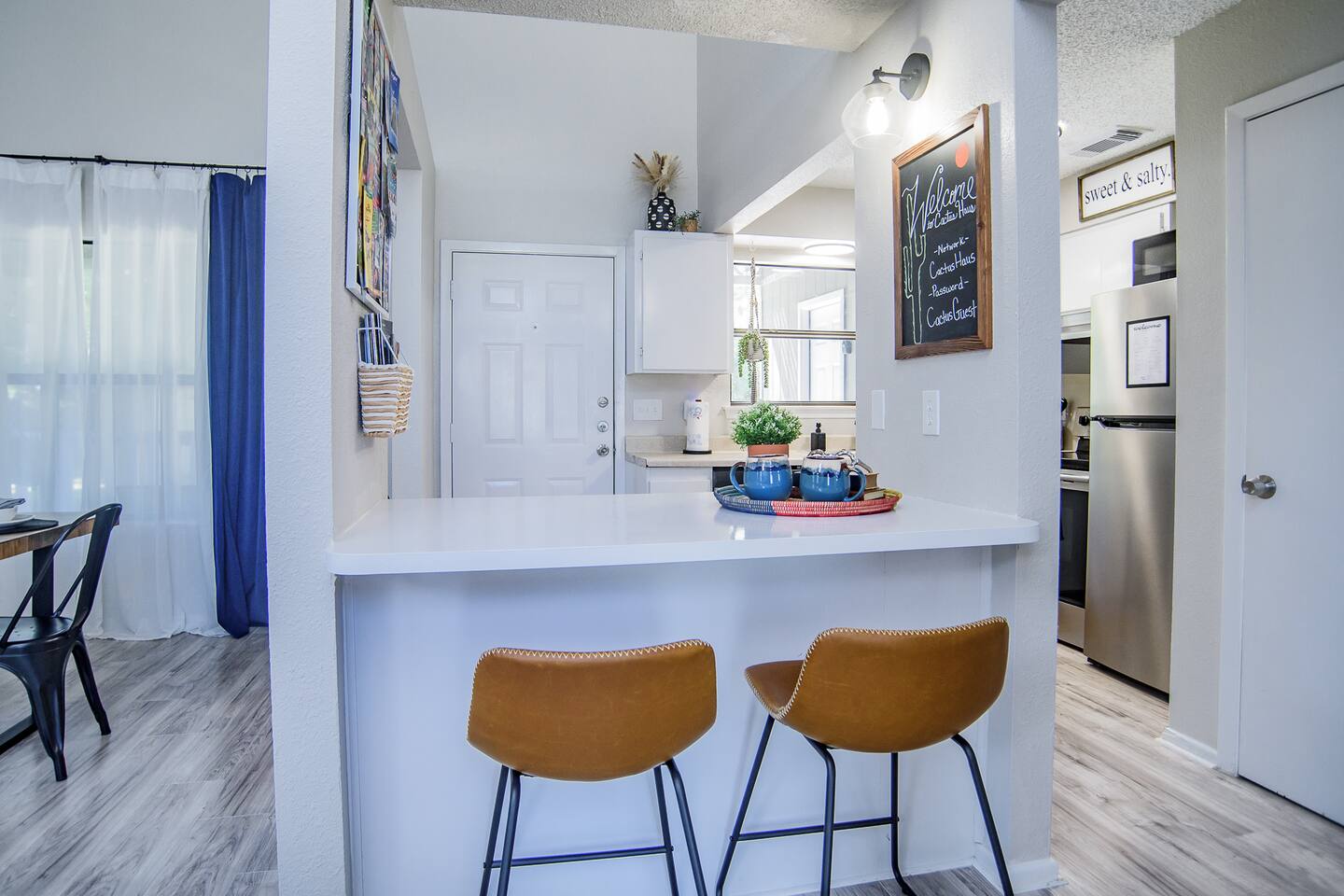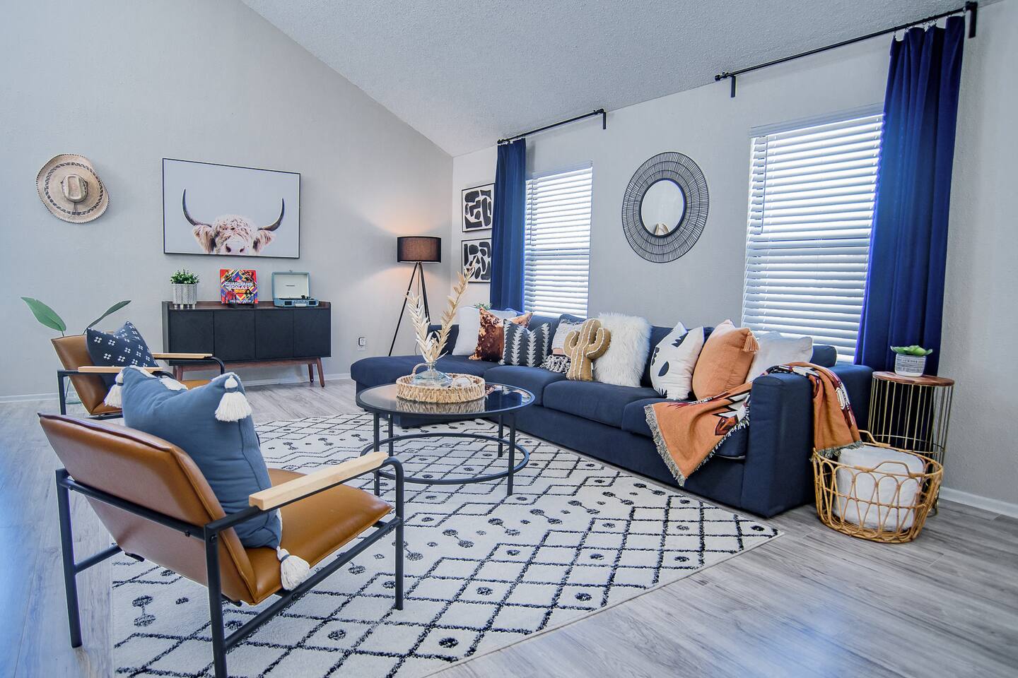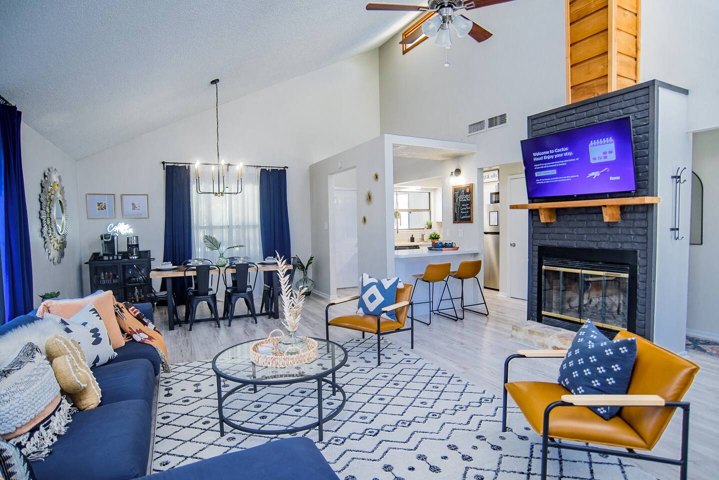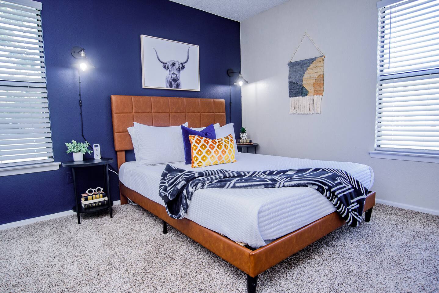 HIGHLIGHTS - 3 bedrooms / 2 bathrooms - Sleeps 6 - Large Spacious Gated Backyard, Fire Pit, Corn Hole, Yard Yahtzee, Board Games, Charcoal Grill, Hammock and Chair Hammocks, Coffee Bar, Record Player, High Chair and Pack-in-Play. SLEEPING ARRANGEMENTS - Primary bedroom - 1 king bed - adjoined bathroom - Roku TV - Secondary bedroom - 1 queen bed -Third bedroom - 1 double bed -Extra air mattress in living room. Introducing Cactus Haus, a modern Texas decorated home located in the charming city of New Braunfels, Texas. Situated on a spacious half-acre lot just outside the city limits, our property offers a peaceful and serene setting while still providing easy access to all the attractions and amenities in the area. Conveniently located just 5 miles from Downtown New Braunfels, 6 miles from Schlitterbahn Waterpark and the beautiful Comal River, and 9 miles from the historic Gruene district, our home is perfectly situated for you to explore and enjoy everything the area has to offer. The open floor plan of our home is designed to provide ample space and comfort for a single family or a group of friends. Whether you're on a family vacation, a weekend getaway, or a long-term stay for work, our home has everything you need to feel right at home. The master bedroom features a comfortable king-size bed, ensuring a restful night's sleep. Outside, you can relax and unwind in the chair hammocks or gather around the fire pit for cozy evenings under the stars. Stay connected with fast WIFI throughout the property, and enjoy your morning coffee at our convenient coffee bar. We also welcome work groups and families, offering amenities to accommodate their needs. With ample parking space for trailers and boats, our property is perfect for those who want to explore the nearby Schumann's Beach Boat Ramp and enjoy access to Lake Dunlap. Whether you're seeking adventure, relaxation, or a productive work stay, our Airbnb property in New Braunfels, Texas, provides the ideal base for your stay. Book now and experience the best of what this charming city has to offer.