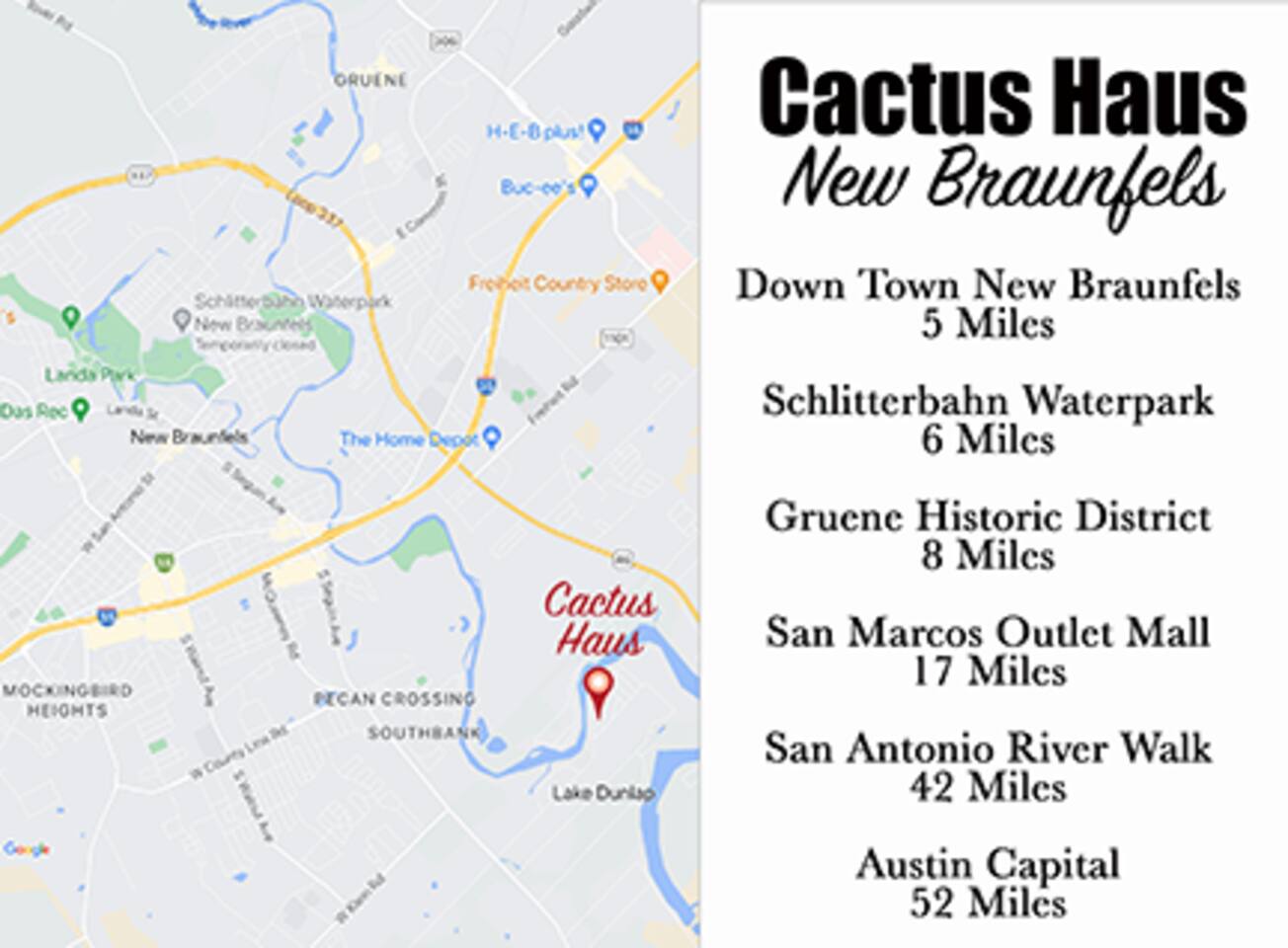 Our home is located in a peaceful countryside setting on a spacious half-acre lot. There is a small two-step staircase at the entrance. Please be aware that wildlife such as deer, skunks, hogs, and other animals may be present in the area. We are conveniently close to Lake Dunlap, just a block away, with Schuman's beach boat ramp a few blocks away for easy access. The recent repair of Lake Dunlap's dam has restored the lake to its full levels, providing great opportunities for fishing, water skiing, wakeboarding, and wake surfing. Cactus Haus is 6 miles from Schlitterbahn and 9 miles from Gruene. During the busy season, it may take 15-20 minutes to reach Schlitterbahn due to summer traffic. Please note that the City of New Braunfels only allows Airbnb's in commercial and out-of-city limits areas, so finding larger homes within a mile of Schlitterbahn and Gruene may be challenging.