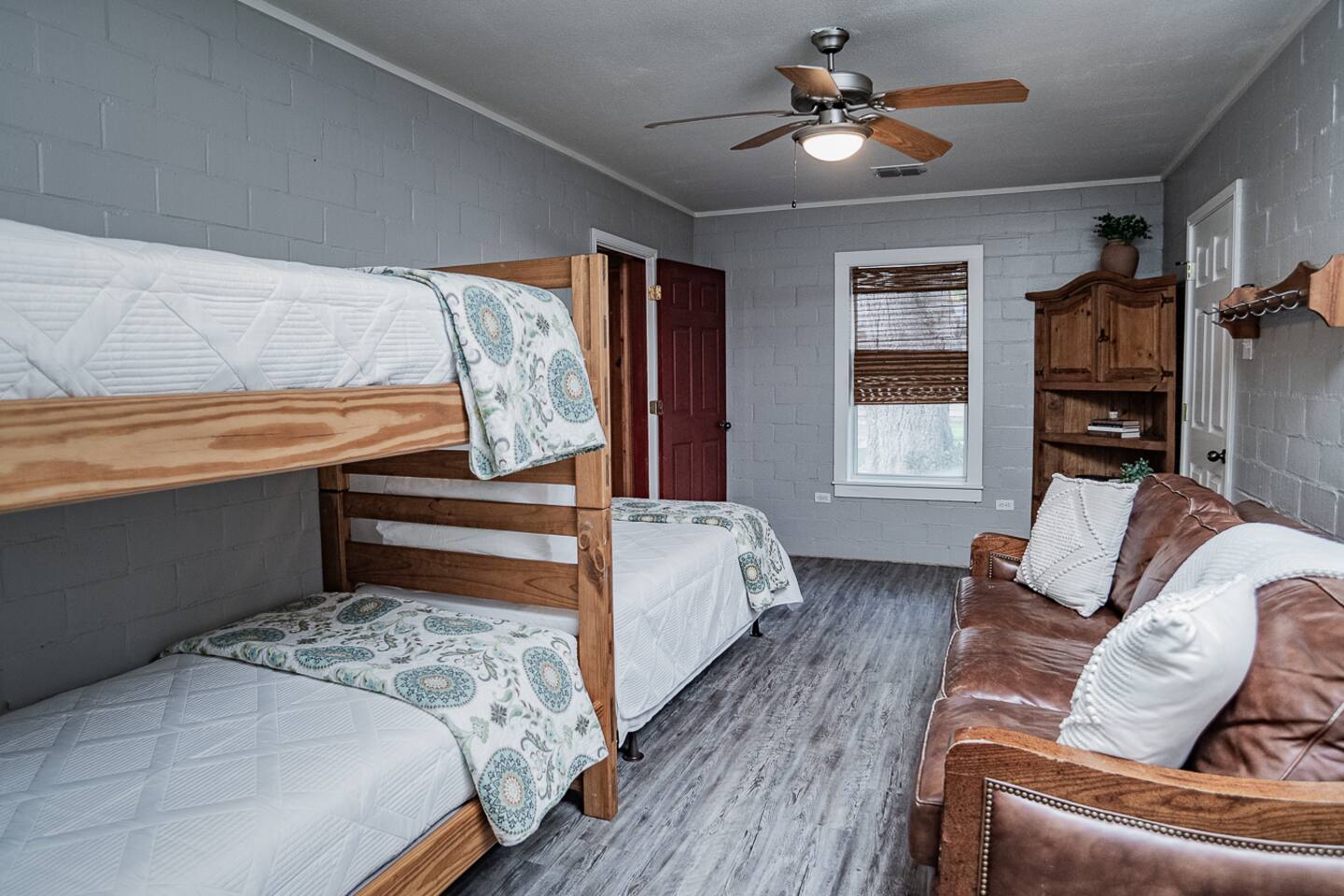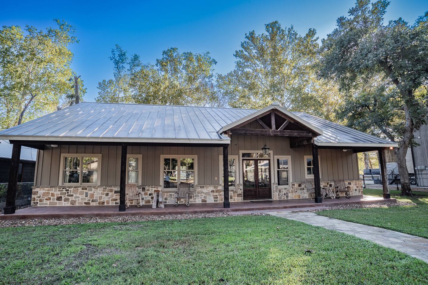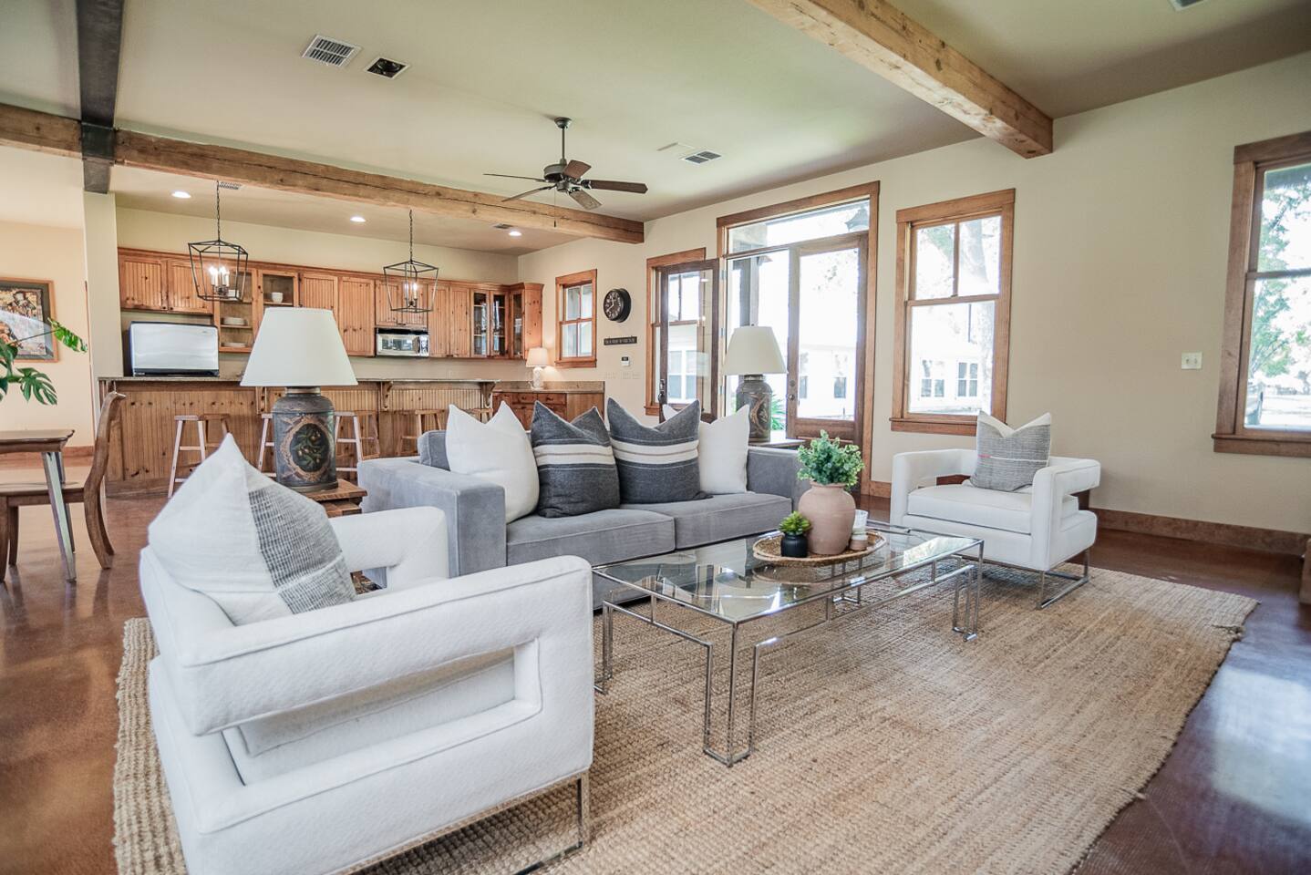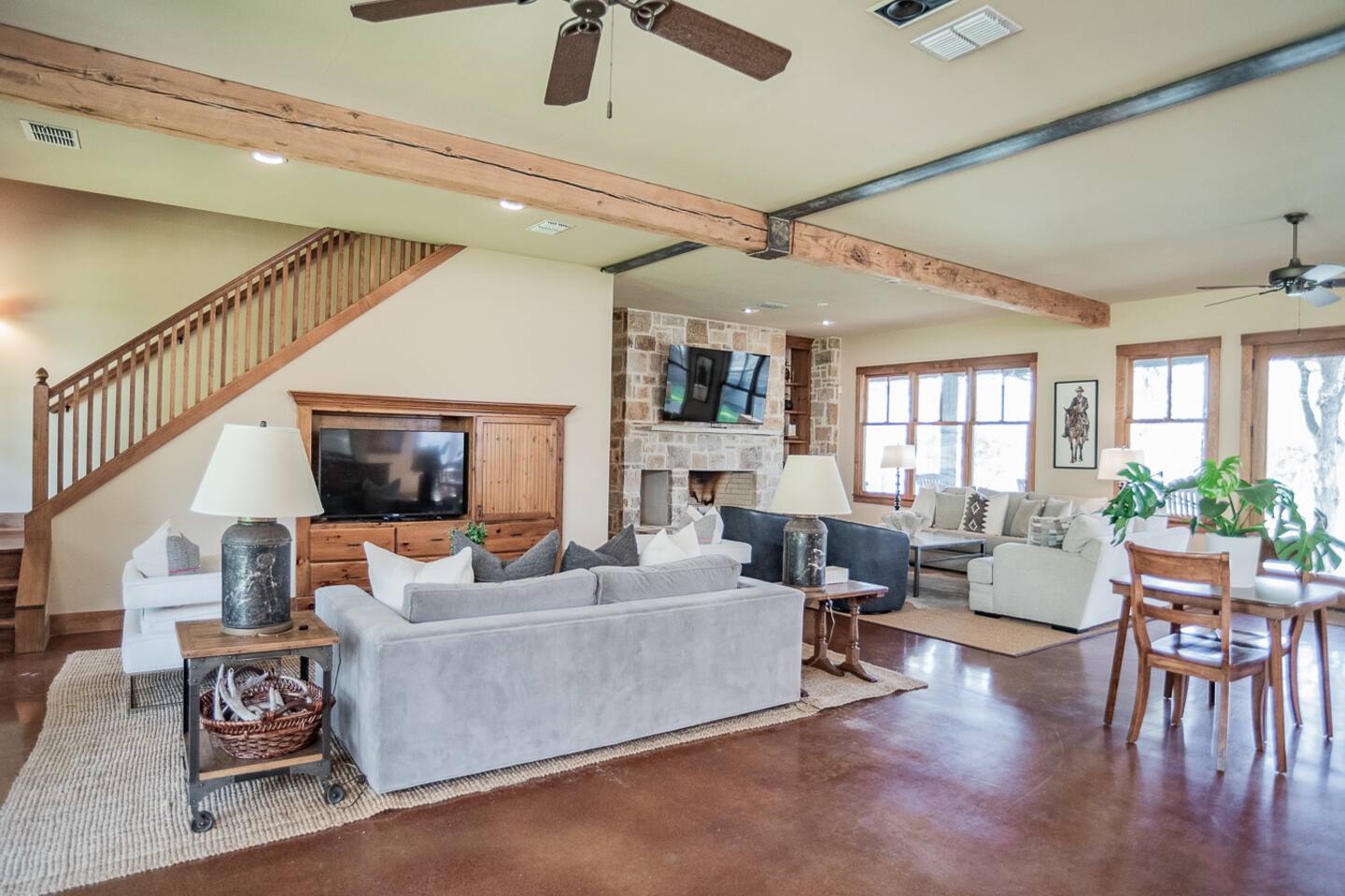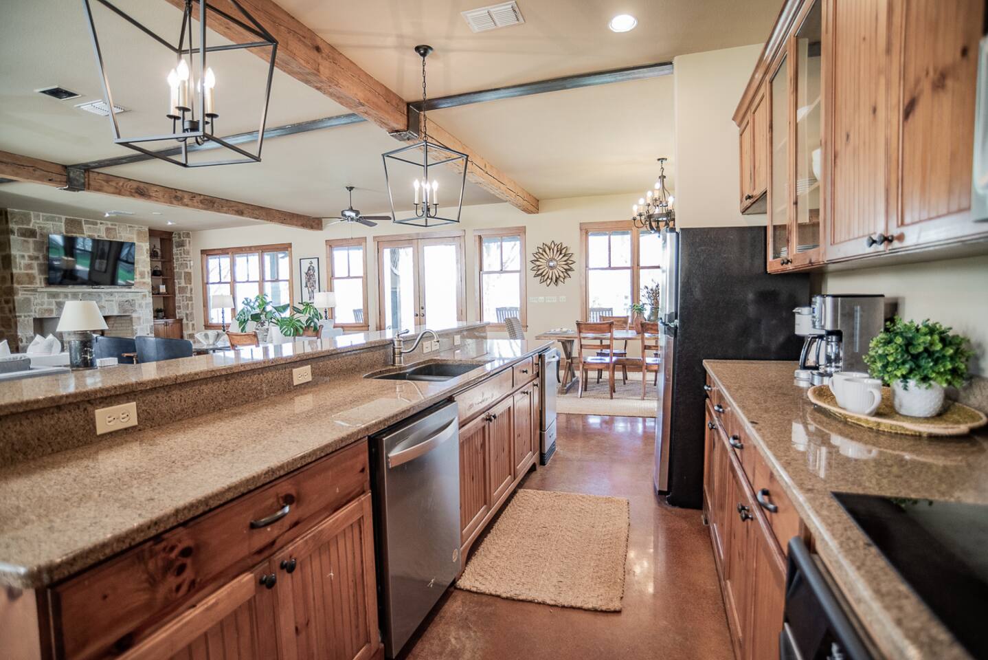 Luxury Lake McQueeney Family Retreat – 5,000 sq ft Farmhouse + Bunk House – Sleeps 16 Elegant Comfort. Scenic Lake Views. Unforgettable Family Getaways. Located just minutes from New Braunfels, this expansive private estate on Lake McQueeney is the perfect destination for large families or multi-generational groups seeking luxury, space, and entertainment. Please Note: Lake McQueeney is currently undergoing dam repairs, and direct lake access is temporarily unavailable. Guests can still enjoy stunning lake views, fishing off the dock, and relaxing in this tranquil setting. 🌟 Highlights Sleeps up to 16 guests comfortably across a 5,000 sq ft main home and a separate bunk house Game Room Paradise with pool table, ping pong, bar, TV lounge & more Spacious Open Floor Plan – Ideal for family meals, game nights & group gatherings Lakefront Property with dock access for relaxing, fishing & sunset views (note: lake access temporarily unavailable due to dam repairs) Private & Gated Acreage – Over an acre of manicured grounds for outdoor enjoyment Conveniently Located just 15 minutes from New Braunfels & popular attractions like Schlitterbahn, Gruene Hall, and the Guadalupe River 🏡 The Main House This stunning farmhouse boasts a modern-rustic design and ample space for your entire group to relax, dine, and enjoy each other's company. 4 Bedrooms | 3 Full Bathrooms | 1 Half Bathrooms Large open-concept chef’s kitchen, oversized dining area, and comfortable living room perfect for entertaining Private Master Suite (Downstairs): King bed + luxury en-suite bath w/ walk-in shower Bedroom 2 (Upstairs): King bed + shared en-suite with walk-in shower Bedroom 3 (Upstairs): Queen bed + 2 twin-over-twin bunk beds (ideal for kids or cousins) Bedroom 4 (Upstairs): 2 twin beds + adjoining full bathroom with bathtub 🛏️ The Bunk House A separate retreat just steps away, the bunk house is a haven for kids, teens, or late-night hangouts. 2 Bedrooms | 1 Full Bath | 1 Half Bath Game Room: Pool table, ping pong, lounge area with large TV, bar with mini fridge & ice machine Bedroom 1: Twin bed + twin-over-twin bunk, shares bathroom with Bedroom 2 Bedroom 2: Two twin beds + one full-size bed 🌅 Outdoor Amenities Large lakefront dock (currently no water access, but perfect for lounging or fishing) Fire pit for evening s’mores and stories Spacious patio and lawn areas for outdoor games and relaxation Private, gated entrance for added security and seclusion Treat your family to a luxury retreat that feels like a private resort—just a short drive from all the charm and adventure of New Braunfels. Whether you're reconnecting with family, celebrating a milestone, or just escaping the city, this estate has everything you need for a memorable stay.