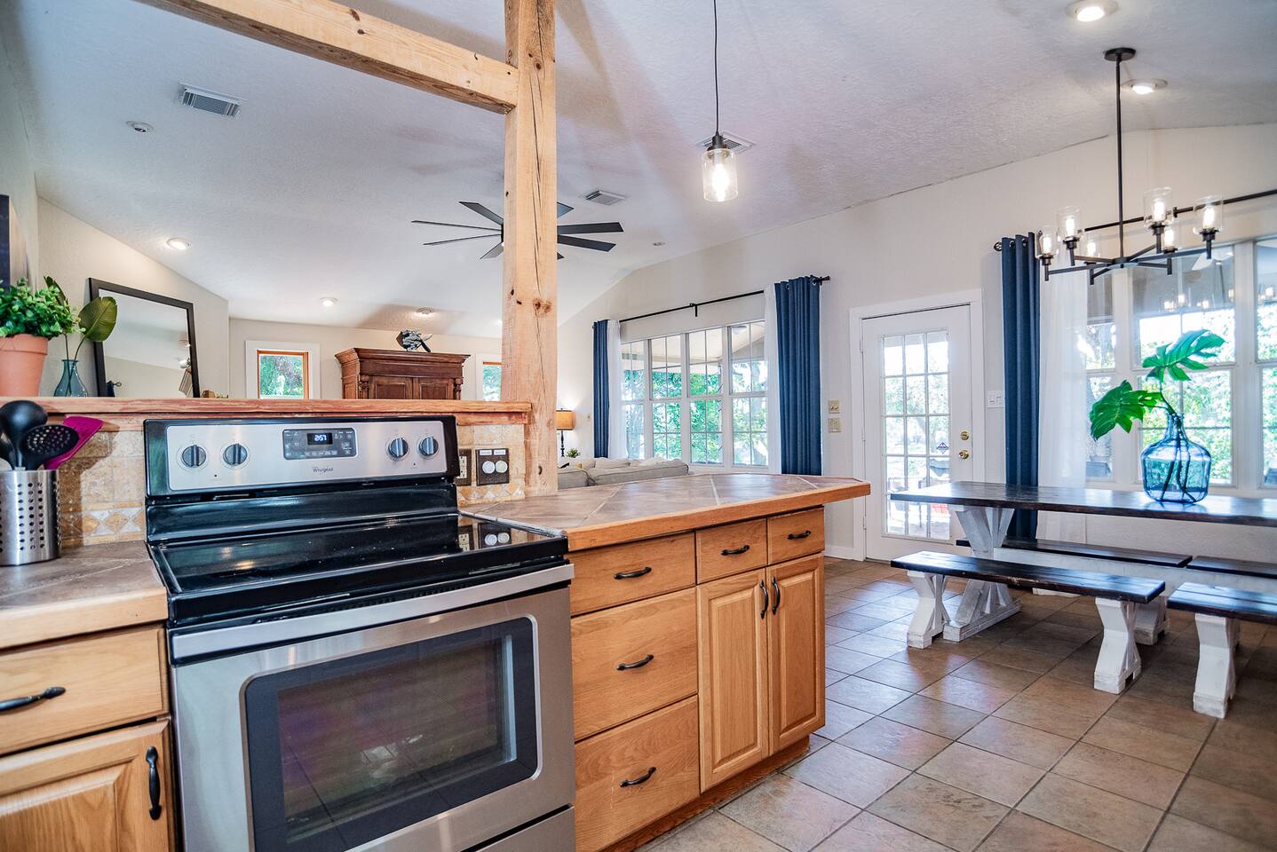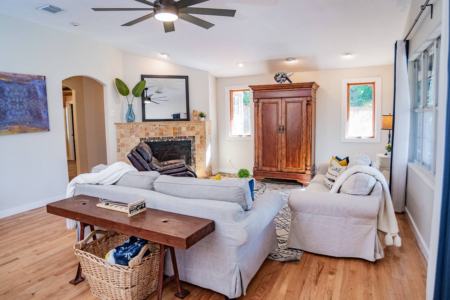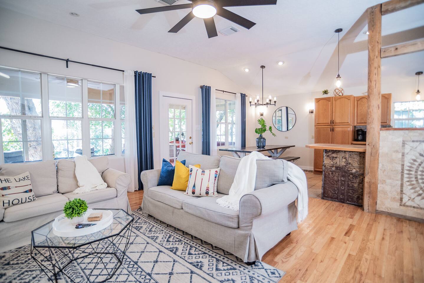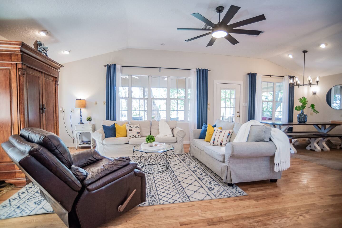 Nestled along the Guadalupe River, Pecan Grove Retreat offers a prime location midway between Austin and San Antonio. Ideal for two families, the home boasts various amenities including three kayaks, a paddle board, ping pong table, foosball table, hammock, hammock chairs, fire pit, and charcoal grill. Enjoy a perfect blend of relaxation and recreation. Close to New Braunfels (25min), San Antonio (45min), Austin (1hr) and Houston (2.5hrs) Corpus (2.25hrs)