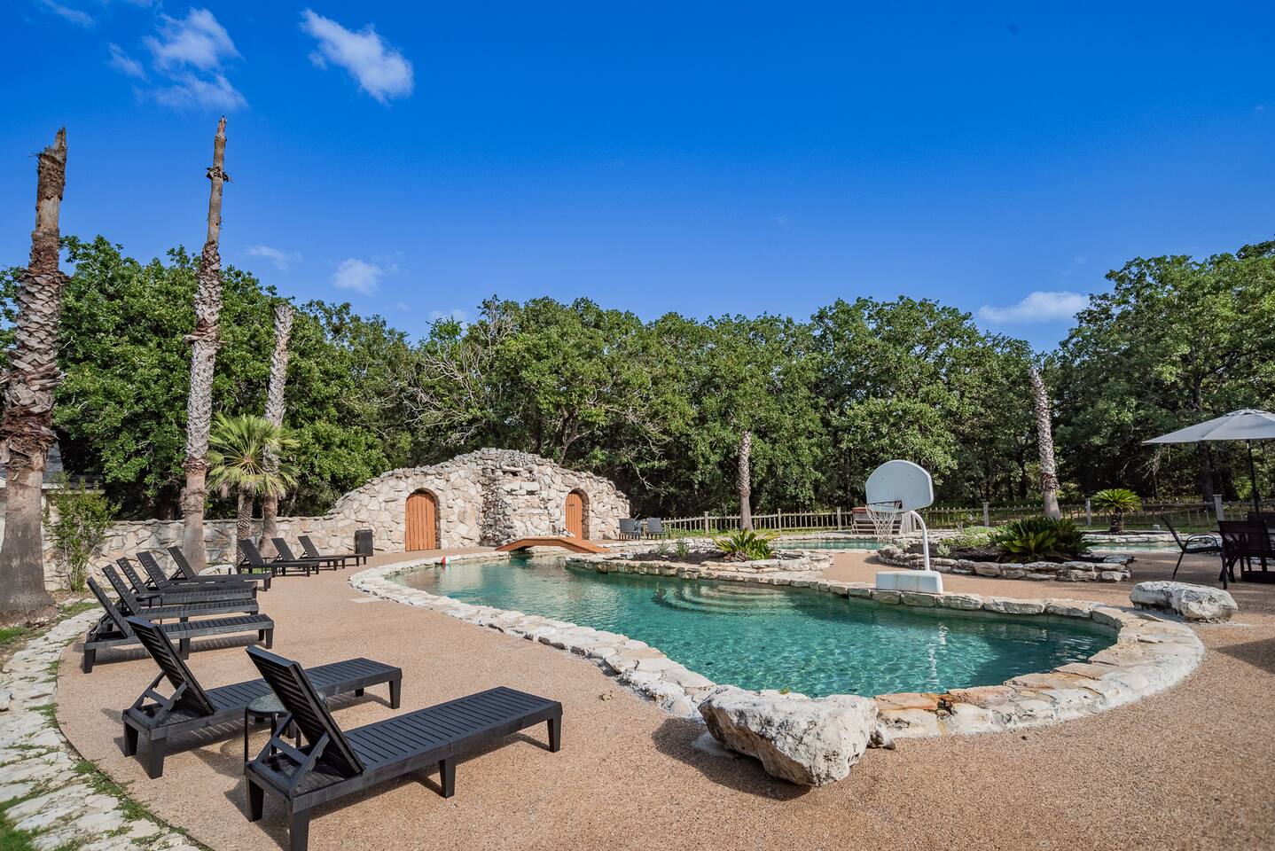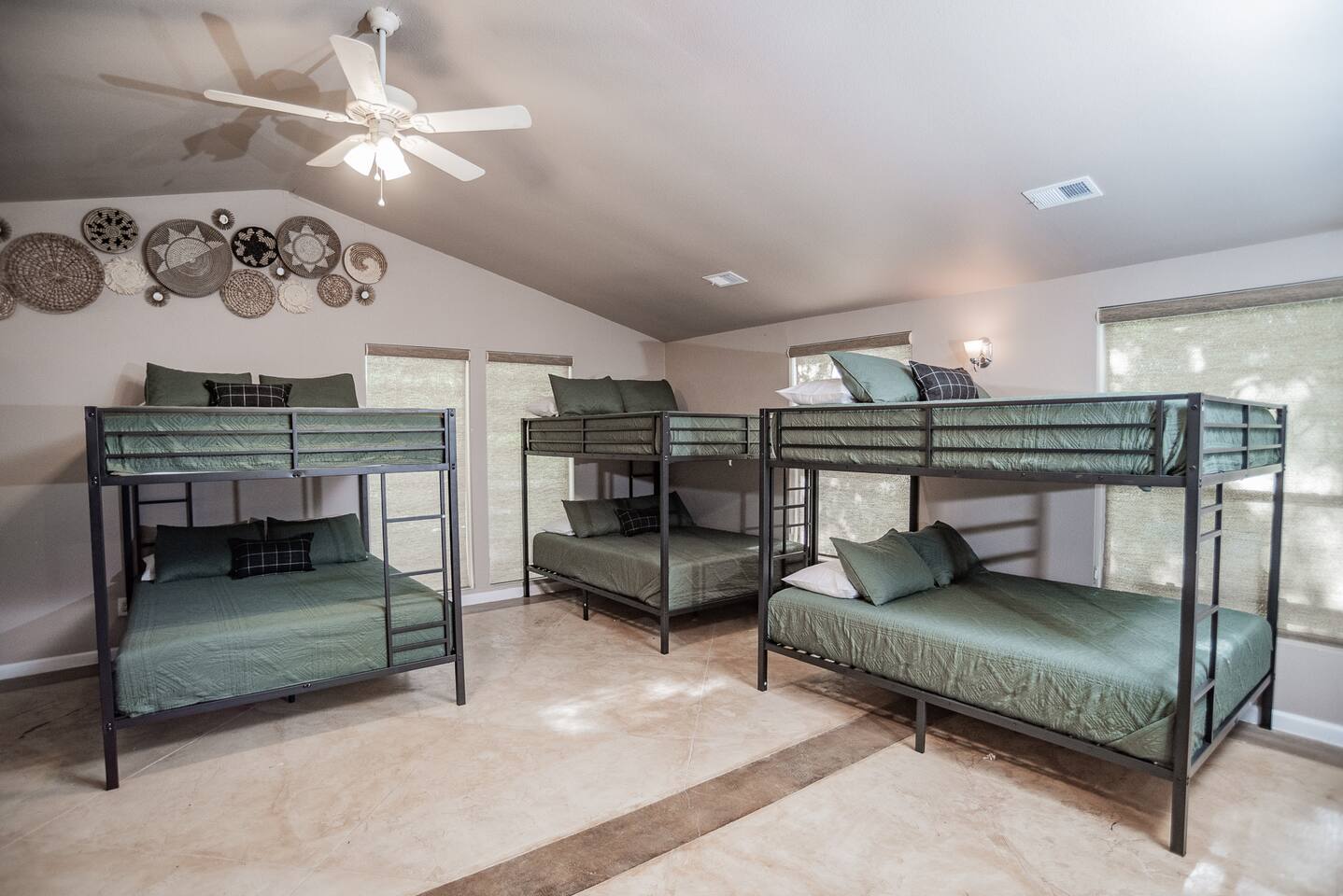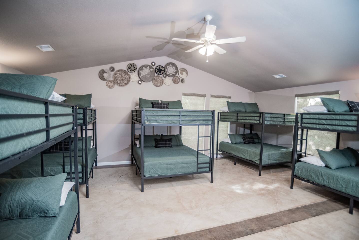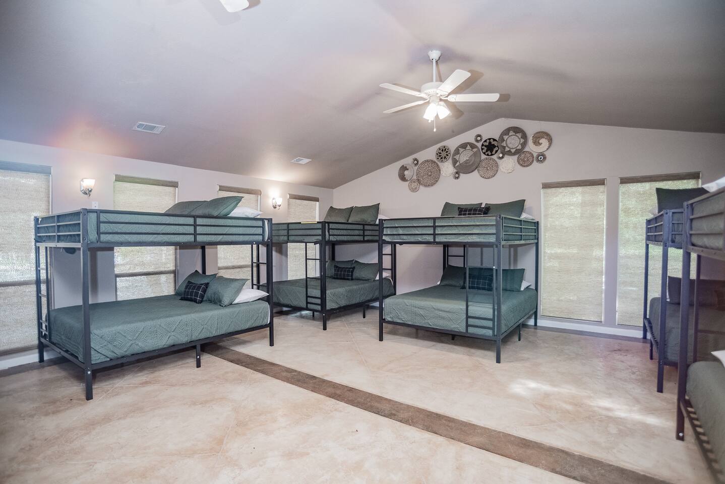 Ready to unplug, unwind, and reconnect with your people in the heart of Texas? Welcome to Lavender Gardens Resort โ a 45-acre private ranch retreat near Luling, where wide-open skies, shady trails, and fresh air set the stage for unforgettable memories. Perfect for church retreats, family reunions, team-building escapes, or just an epic group getaway, this ranch offers the ideal blend of rustic charm and modern comfort. ๐๏ธ Room for Everyone โ Sleeps up to 25 Across Two Fully Equipped Homes ๐ The Main Ranch House 3 cozy bedrooms, including a huge master suite Spacious open-concept living & dining area Fully stocked kitchen with everything but your groceries Smart TVs, WiFi, and board games for unplugged fun Central A/C and heat to keep things comfy, rain or shine ๐ก The Bunkhouse 5 Queen over Queen Bunk Beds (10 Queen Beds Total) Designed with groups in mind โ youth, extended families, or coworkers Second kitchen and casual dining space for easy meal flow Flexible sleeping arrangements โ bunk-style comfort with a side of nostalgia โ๏ธ Outdoor Fun, Ranch-Style Sparkling horseshoe-shaped pool with sun loungers and plenty of outdoor tables and seating Classic fire pit โ perfect for sโmores, stories, and starlit worship Game time: foosball, pool table, and basketball hoop Acres of open fields for kickball, relay races, or a picnic under the oaks Scenic walking trails through fields and shaded woods ๐ฟ Why Guests Love Lavender Gardens: Peace, quiet, and plenty of space โ no neighbors, no noise, no stress Easy, breezy group-friendly layout โ great for meals, sessions, or chill time A breath of fresh air for families, faith groups, and teams looking to refocus and recharge Youโll never feel crowded โ but always connected Local Attractions โ Youโre Right in the Middle of the Fun! ๐ Luling, TX (5 min away) Float or paddle the scenic San Marcos River Visit the historic Zedler Mill and Park Check out the quirky Luling Oil Museum Donโt miss the famous Watermelon Thump Festival every June Grab authentic Texas BBQ at City Market ๐ New Braunfels, TX (30โ40 min away) Go tubing on the Comal or Guadalupe Rivers Make a splash at Schlitterbahn Waterpark Dance at historic Gruene Hallโthe oldest dance hall in Texas Explore the charming Gruene Historic District for shops and bites Visit Animal World & Snake Farm Zoo Picnic or relax riverside at Cypress Bend Park Discover German-Texan history at the Sophienburg Museum Visit Natural Bridge Caverns and Zoo ๐ San Antonio, TX (1 hr west) Explore the iconic Alamo and stroll the scenic River Walk Ride coasters at Six Flags Fiesta Texas or Sea World San Antonio Visit the San Antonio Missions, a UNESCO World Heritage Site Enjoy museums, culture, and incredible Tex-Mex eats ๐ Austin, TX (1 hr north) Catch live music and food truck eats on South Congress Swim in Barton Springs or kayak Lady Bird Lake Watch the bats fly out from Congress Avenue Bridge at sunset Walk the grounds of the Texas Capitol or visit Zilker Park ๐ Your Perfect Group Getaway Starts Here Whether you're roasting marshmallows by the fire, playing in the pool, or hosting sunrise devotionals, Lavender Gardens Resort is your home base for connection, relaxation, and Texas-sized fun. Need more space? Ask about our 2 other homes on the property that sleep an additional 14 people.