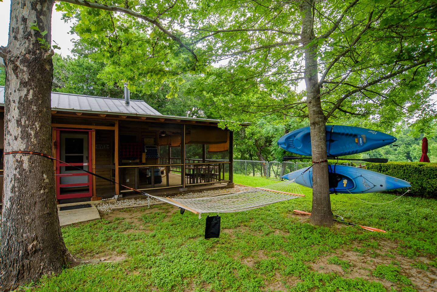 Secluded Log Cabin Country Getaway on the Guadalupe River that Sleeps Six. Large private backyard on the Guadalupe River with kayaks, ping pong table, oversized Jenga & Connect Four, Corn Hole, outdoor swings and hammocks. River provides amazing wilderness for kayaking, swimming and fishing for bass & catfish. This home is situated conveniently between Austin & San Antonio. New Braunfels (30min), Austin Airport (1hr), San Antonio Airport (1hr), Houston (2.5hrs) Corpus Christi (2.5hrs)